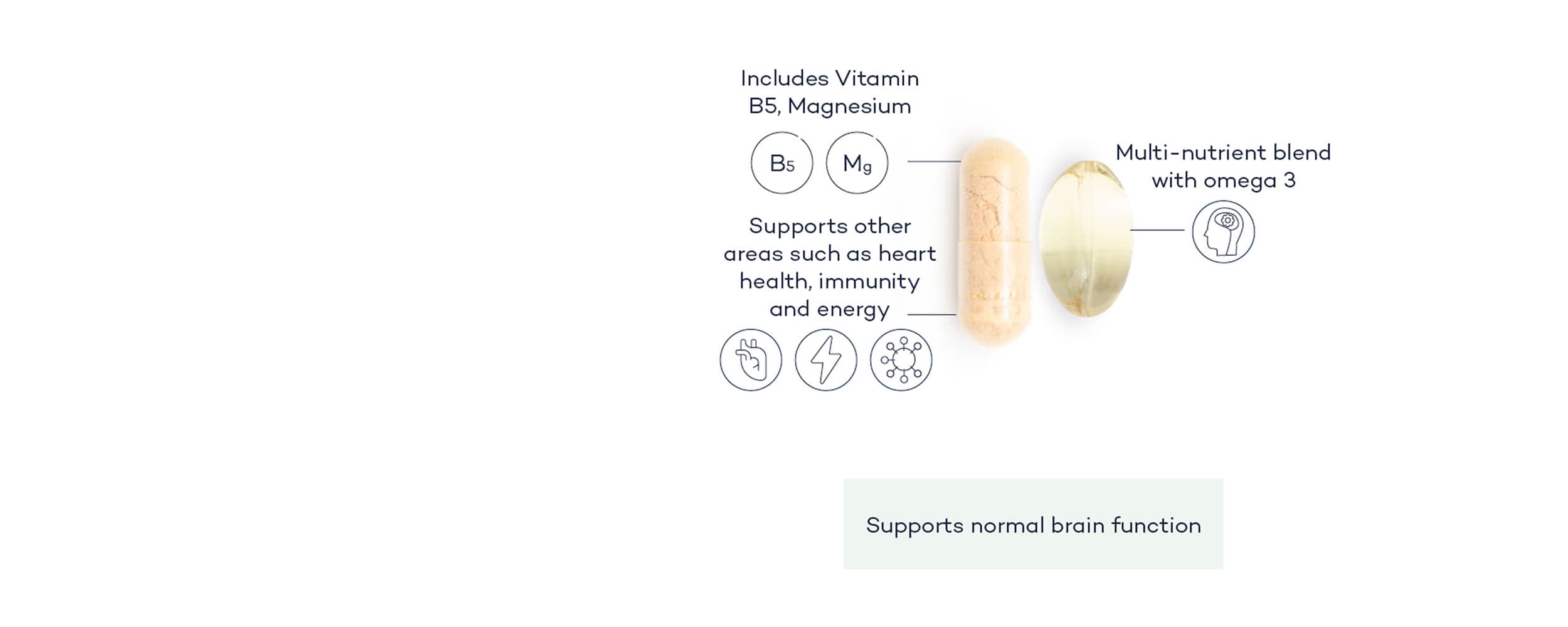 High-quality omega-3 DHA supports normal brain function, while pantothenic acid (B5), iron, iodine, and zinc contribute to memory, concentration, and cognition. B vitamins, magnesium, and L-methyl folate promote psychological wellbeing, healthy homocysteine levels, and red blood cell formation.