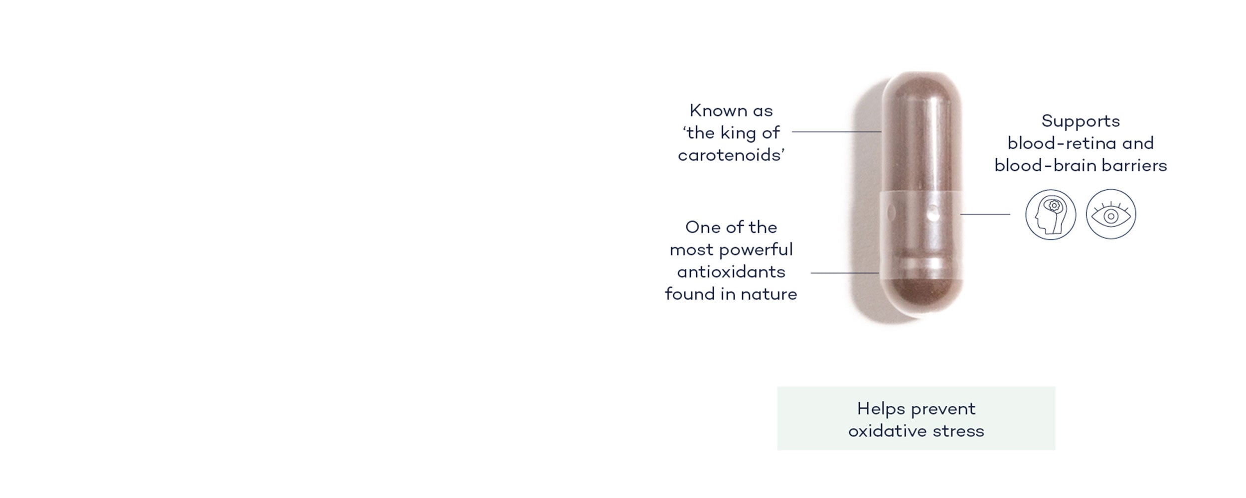 Astaxanthin is one of nature's most powerful antioxidants, 6,000 times stronger than vitamin C. Known as ‘the king of carotenoids’, it’s able to cross the blood-retina and blood-brain barriers, where its powerful antioxidant actions reduce the effects of free radicals, protecting against cell damage.