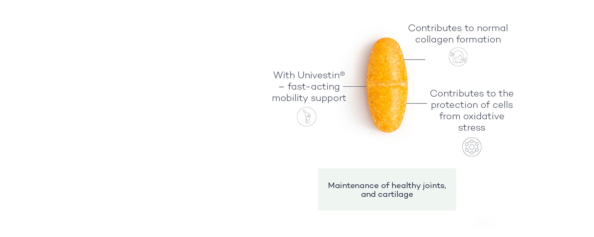 We’ve also included Univestin®, an innovative botanical blend developed for fast-acting joint support, with noticeable effects within just one week. It’s been proven effective by over 25 years of research and 22 studies, including human trials.