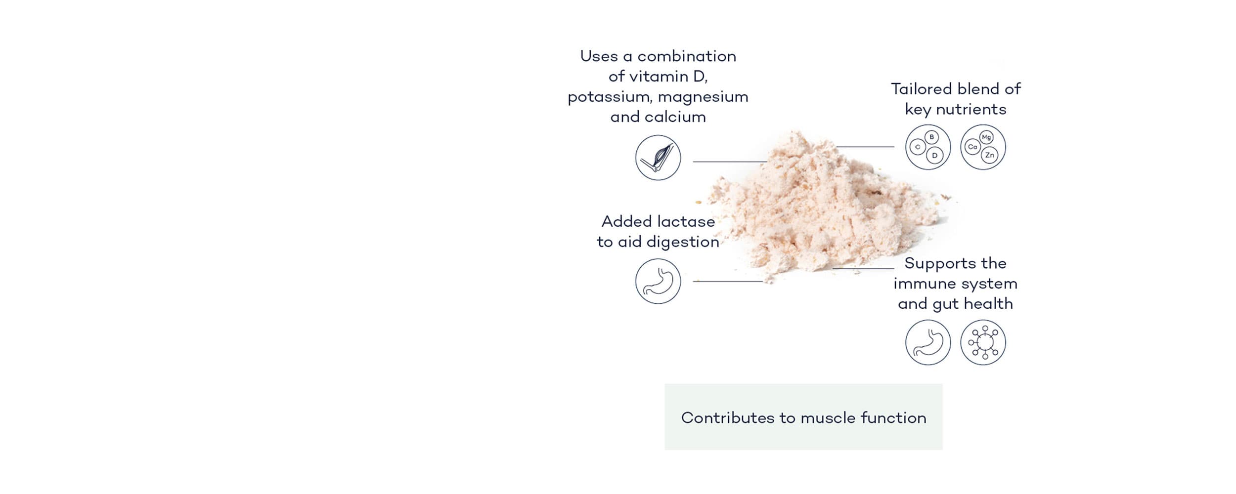 Protein is the most important nutrient for muscles, as they are often in a state of flux breaking down and reforming new tissue. Protein is also required for other tissues such as bones, blood, and hormones. Whey protein is considered the ‘best’ protein when compared to other forms available as it contains the highest proportion of essential amino acids which cannot be naturally synthesised by the body. Muscle loss happens as a result of the ageing process, so this formulation has been developed specifically with the over 50s in mind.