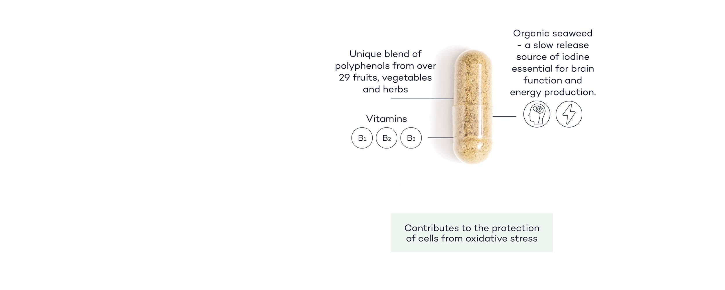 PhytoEnergy+ multi-nutrient includes extracts of over 29 fruits and vegetables, iodine & B2 which protects cells from oxidative stress.