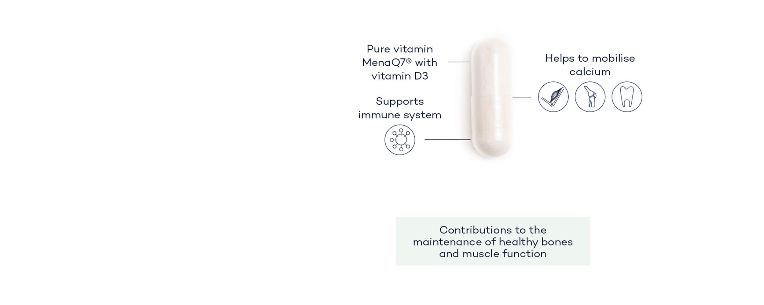 Vitamin K2 works together with vitamin D3 to mobilise calcium from the blood vessels into the bones, maintaining bone health. The vitamin K2 we’ve included has been the subject of 19 research studies that highlight its importance to multiple areas of human health.